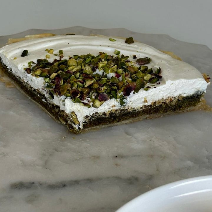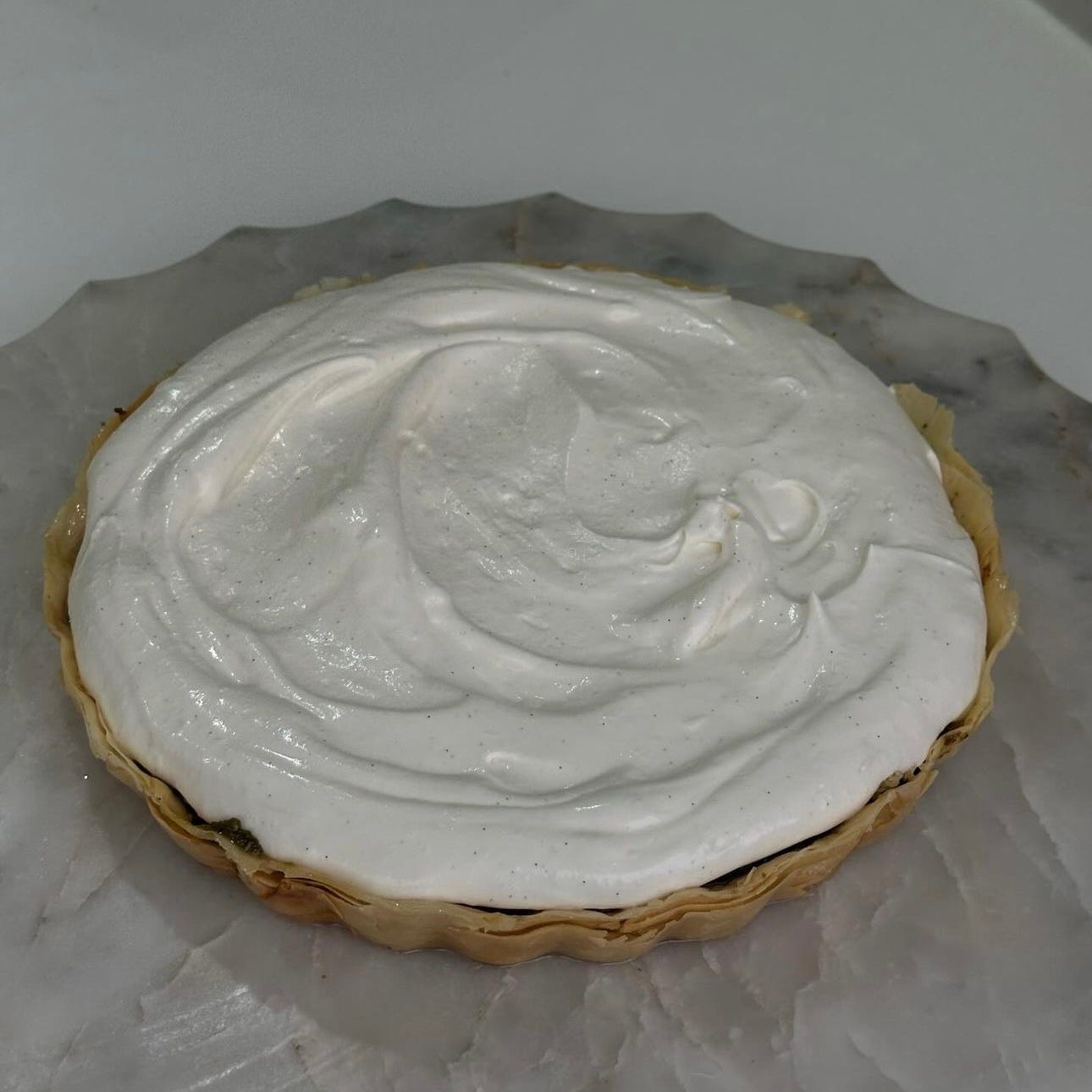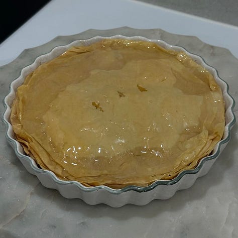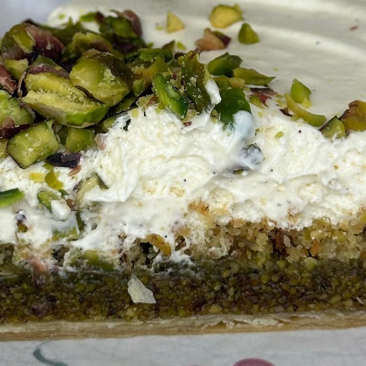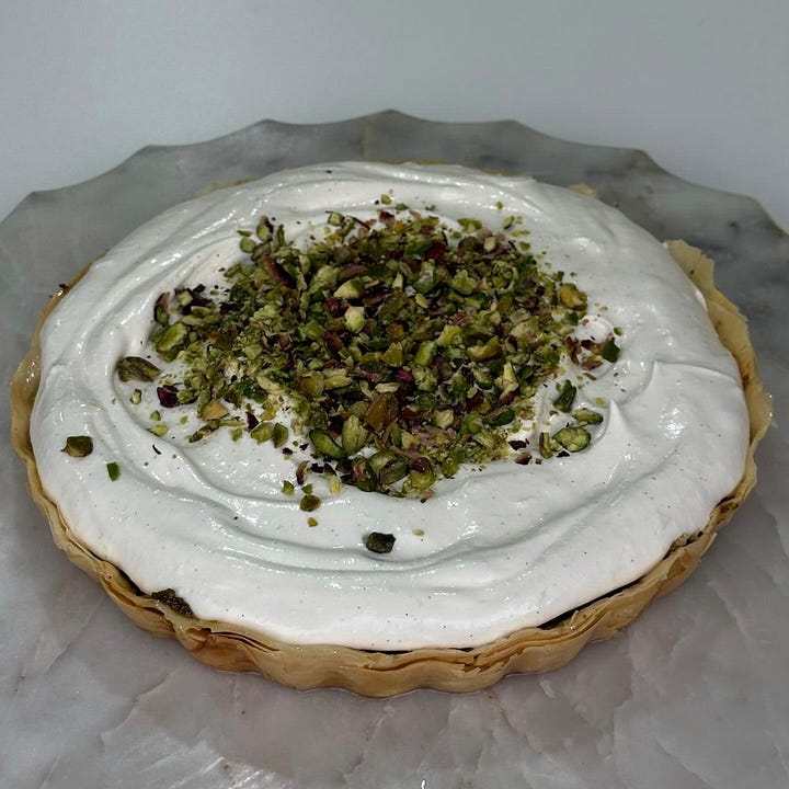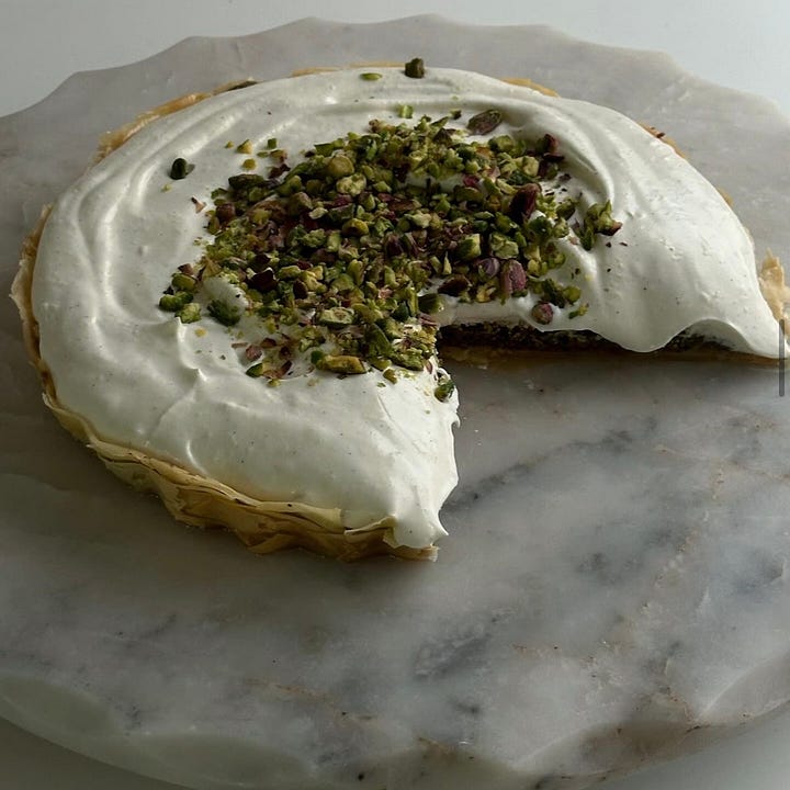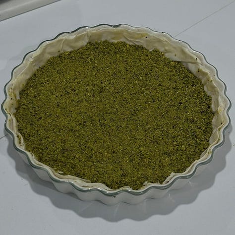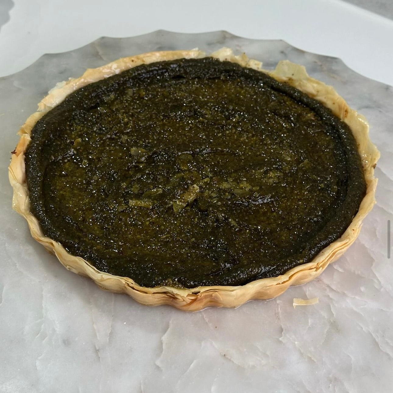 Lay the filo pastry sheets so they are flat. Leave the sheets in room temperature for 10 minutes. After this begin layering your sheets one by one with melted butter brushed in between. First filo pastry sheet, layer butter. Second sheet, layer butter. Repeat this until 13 sheets are layered in your tart baking tin. Add the pistachio crumble. Top with 1 pastry sheet to ensure nuts do not burn. Bake until all layers are cooked through, on 160 degrees celsius for 45-60 mins. As soon as you take the bake out of the oven, remove the top layer and coat in Lebanese sugar syrup infused with rose water or maple syrup.