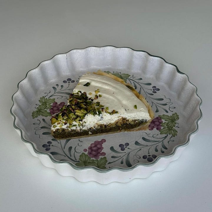 My mind really took me there, when this post was really supposed to focus on a pistachio baklava tart. Nothing new, really. Sometimes, I will be lost in thought whilst baking and sometimes baking stops my thoughts. You might have just stepped into my kitchen for a little and had a chat. If it was tonight, this would be the topic. Back to the focus, sweet light beautiful dessert.