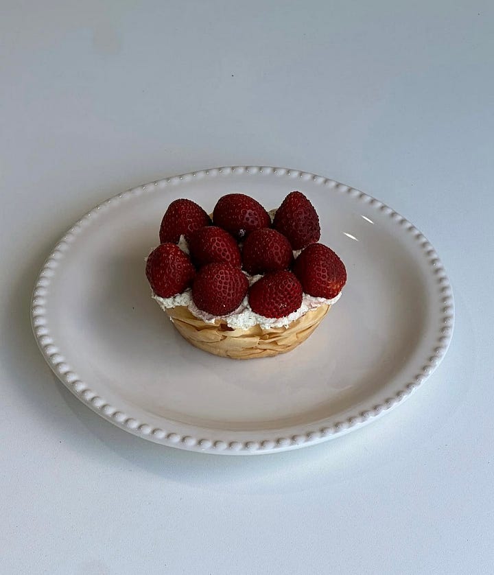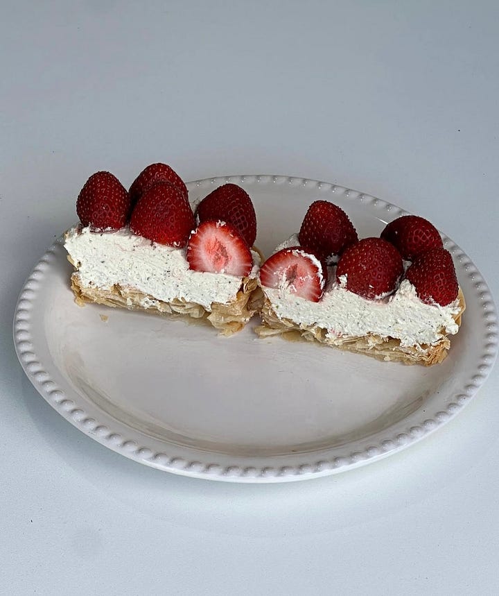 Hello. A little tart. She is. Baklava layered with pistachio praline, cream and fresh strawberries. There is the option to add strawberry jam too. It depends on how fruity you want her to be! Crisp, sweet and light. Of course, inspired and adapted from my mother’s traditional Lebanese baklava recipe.