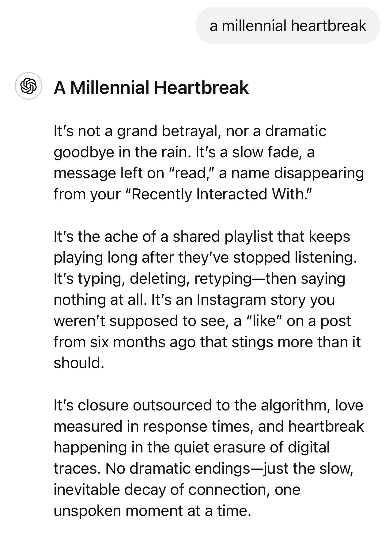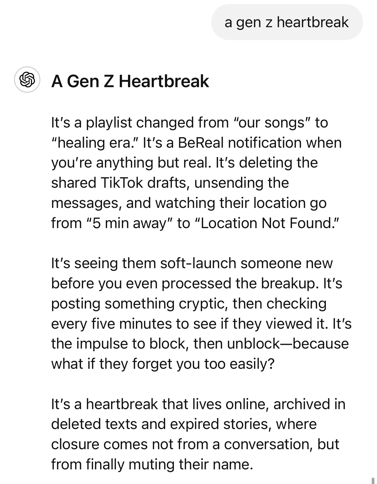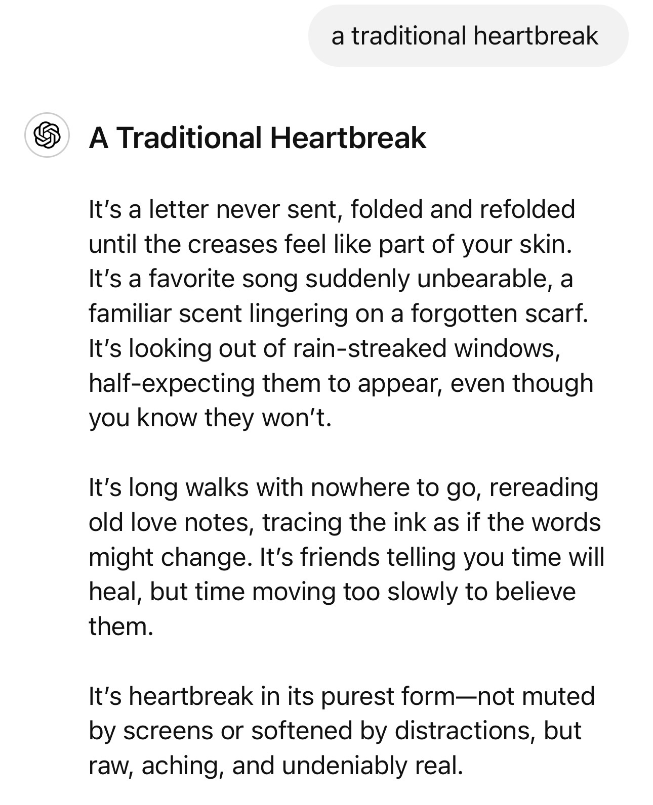 The deepest heartbreak I’ve ever felt is grief. Although experiencing loss whilst one is still physically present aches differently. I don’t know the scientific background behind this. I do know that I opened ChatGTP on my phone and asked it the following questions.